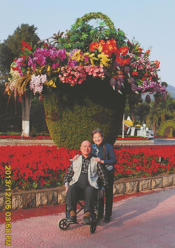 2013年12月5日,刘秀美推着坐在轮椅上的刘良达在公园盆景前留影。