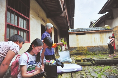 13日,3名女大学生挥别院田村的孩子们,结束了为期一周的龙岩革命老区艺术公益行动。一周前,她们——福建师范大学协和学院艺术支教暑期社会实践小分队的康英英、梁雪梅、陈妍,带着专业乐器和美术用具,来到距龙岩城区100多公里的上杭县太拔乡革命老区基点村院田村,教那里的孩子学习画画、唱歌和乐器演奏,为革命老区的孩子们送上了难得的艺术课。