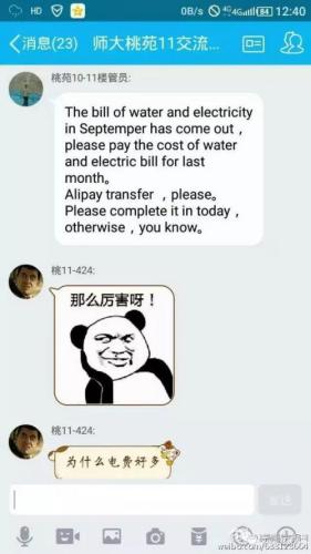 @福师大生活圈:福师大桃苑11宿舍舍管在宿舍群里用英语提醒同学们及时缴纳水电费,和同学的一回一答,英语全程亮了!同学高呼:十二月,英语四六级舍管大叔求带飞!Handsome boys,遇到这样的舍管还不赶紧交水电费!