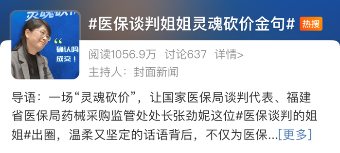 这两天,在今年的医保药品谈判现场再现“灵魂砍价”。#医保谈判姐姐#张劲妮和她的“砍价金句”持续登上热搜,并刷屏朋友圈。