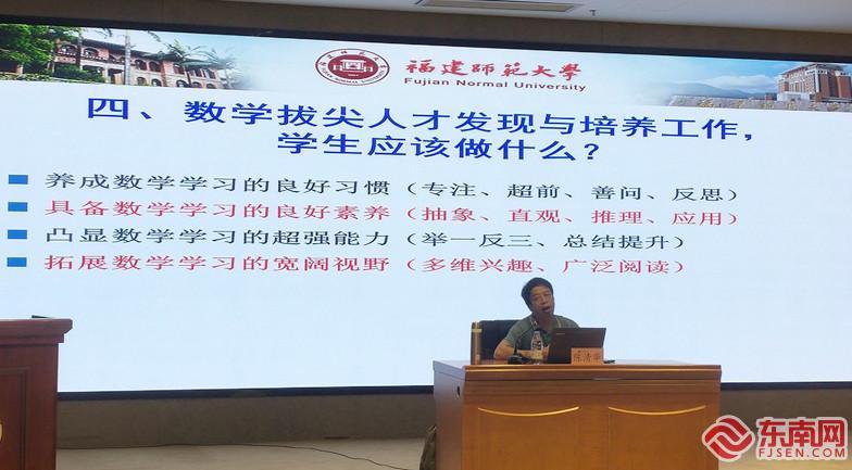 作为第一位名师讲坛授课教师,福建师范大学数学与统计学院、福建数学基础教育研究中心主任陈清华教授以数学学科为例,为师生深入剖析分享了当前数学拔尖人才发现与培养工作的现状,希望同学们努力提升数学素养,用数学的眼光观察、思考、表达现实世界。他说:“许多题目小学生可以做,大学生做不了,这就体现了基础学科知识的重要性。同学们现在就要培养良好的数学学习习惯,力争青出于蓝胜于蓝,为中华民族的伟大复兴贡献力量。”