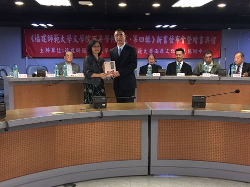 新书发布会上,福建师范大学副校长郑家建(前右)向台湾师范大学国文学系主任许俊雅赠书。