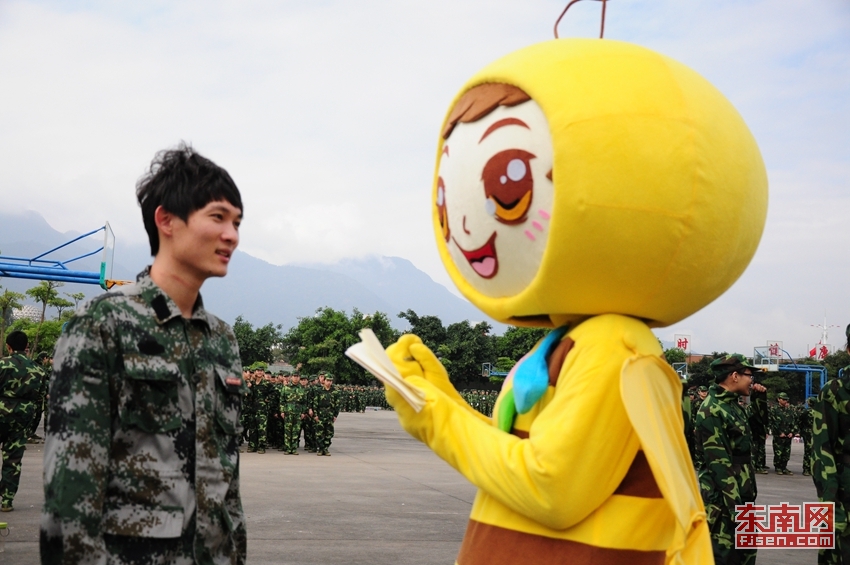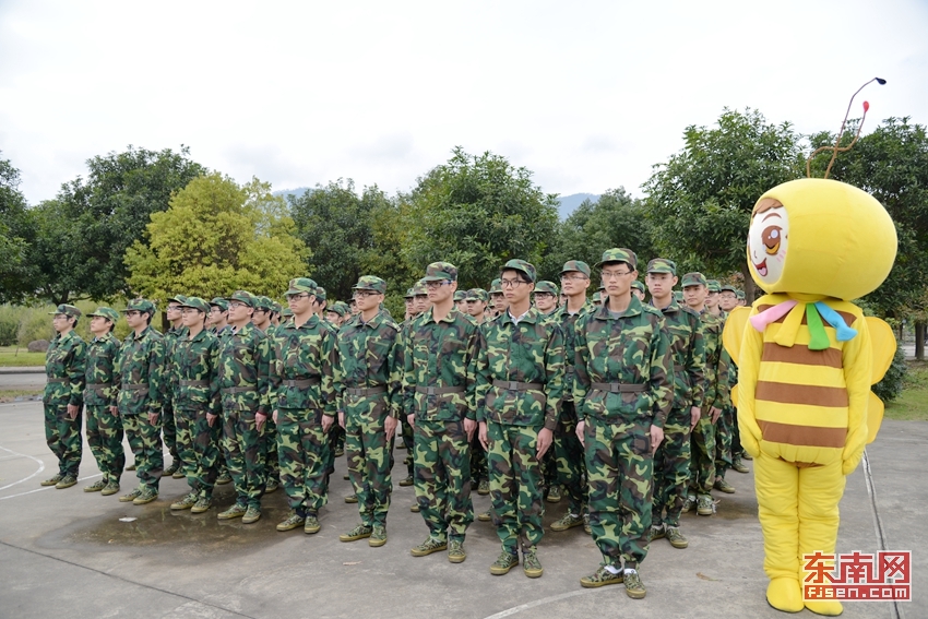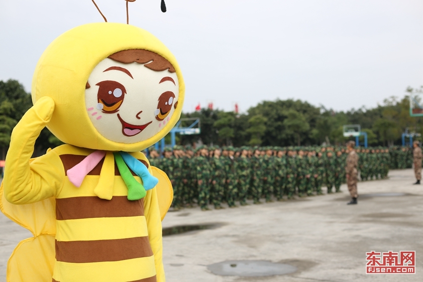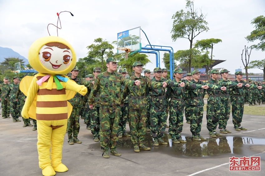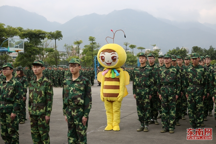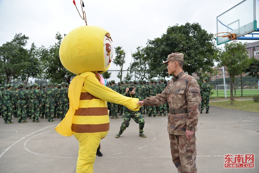 东南网1月8日讯(通讯员 黄艳艳/文 刘绍懿 叶晓晖 林晓燕/摄)近日,正值福建师范大学协和学院2015级新生军训,在一片迷彩绿中,一只蜜蜂造型的萌宠格外醒目。它时而站军姿,时而练习转体动作,时而打起军体拳……憨态可掬的萌宠,给原本艰苦的军训增添了几分欢乐。