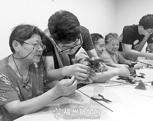图片志愿者教老人制作花朵。