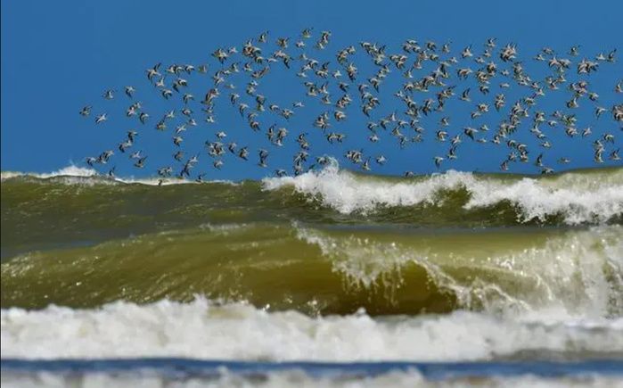 一群鸟飞越闽江河口湿地国家级自然保护区沙滩(2022年11月13日摄)。新华社记者 魏培全 摄