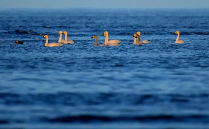 一群小天鹅在闽江河口湿地国家级自然保护区海面上觅食(2023年1月31日摄)。新华社记者 魏培全 摄
