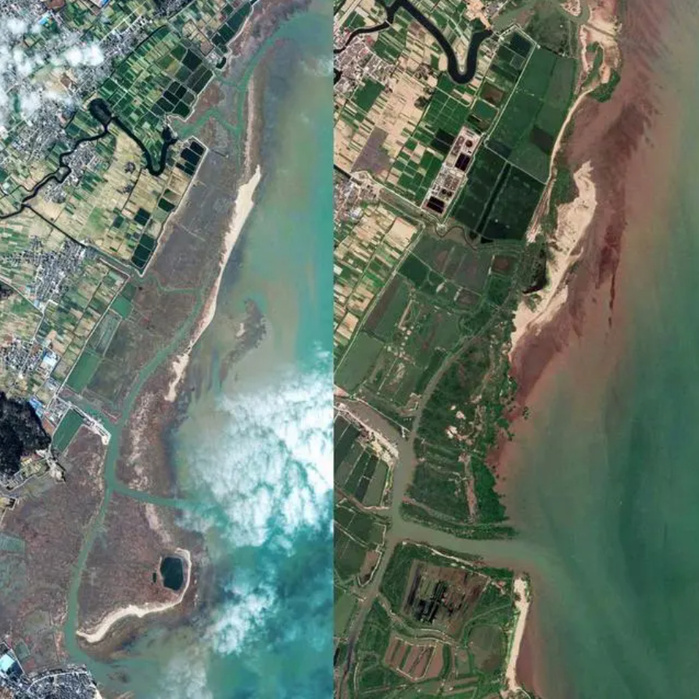 这是一张拼版照片:左图为2009年4月份的闽江河口湿地国家级自然保护区卫星图;右图为2020年6月份的闽江河口湿地国家级自然保护区卫星图。新华社发(闽江河口湿地国家级自然保护区供图)
