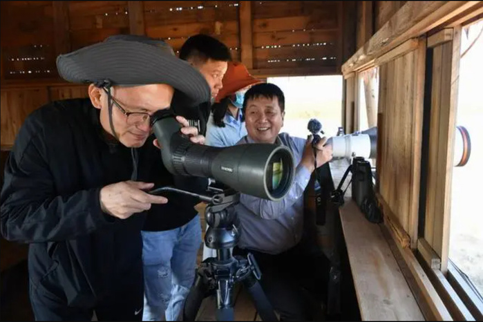 闽江河口湿地国家级自然保护区管理处主任郑航(右一)和同事在闽江河口湿地核心区域观鸟屋里,用望远镜和相机观测记录停留在湿地里的候鸟种类(2022年11月19日摄)。新华社记者 魏培全 摄
