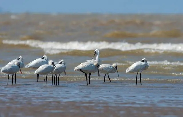一群黑脸琵鹭在闽江河口湿地海滩上觅食(2023年5月9日摄)。新华社记者 魏培全 摄