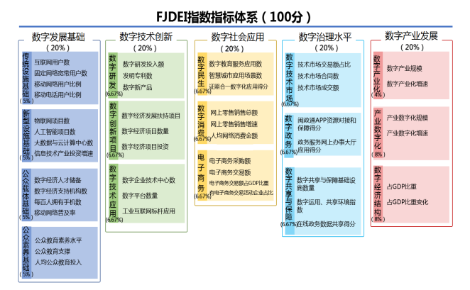 2019年FJDEI指数评价由省经济信息中心牵头,联合福建师范大学经济学院共同开展,指标体系由5个一级指标、16个二级指标和48个三级指标组成,从数字发展基础、数字技术创新、数字社会应用、数字治理水平和数字产业发展五个方面,评估九市一区数字经济发展状况,为我省数字经济高质量发展提供参考。