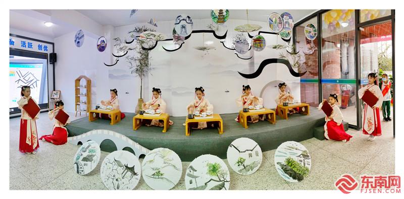 展示现场,逸夫楼教室、田径场处处呈现一片欢腾的海洋。白墙瓦屋,曲线山墙,以福州三坊七巷为造型精心布置的特色墙,以西湖拱桥、上下杭等为创作素材的手工作品、绘画作品、篆刻作品,让前来交流的老师们接受浓浓福州传统文化的熏陶。一群衣着素雅、动作优美的孩子为前来观摩的老师们展示茶艺魅力,为客人们泡上芳香四溢的福州茉莉花茶。