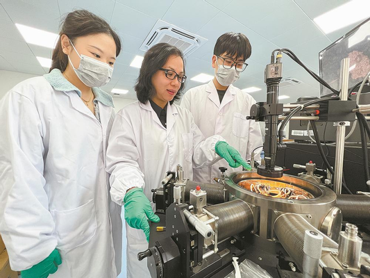 张章静教授(中)正在使用电子探针平台,与学生讨论实验结果。