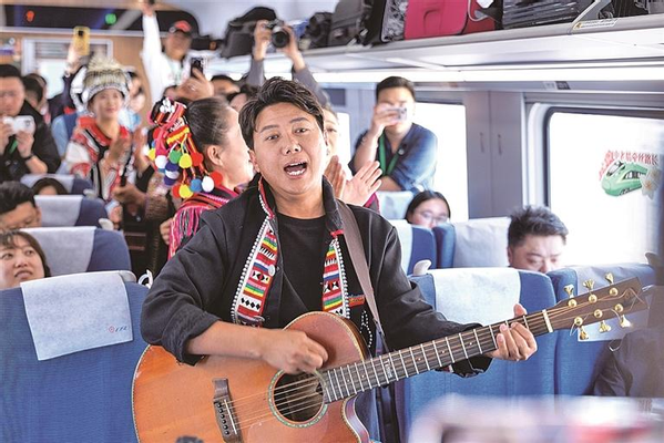 4月14日,演员在昆明开往万象的列车上表演。新华社发