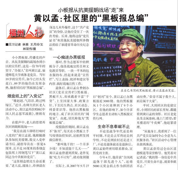 小小黑板报,传播党的声音。从抗美援朝的战场办到小区的宣传栏,这是一份70年的坚守。“办报人”名叫黄以孟,福建师范大学离休老党员。当年19岁的宣传兵,如今已经头发花白,89岁的他仍在发挥余热,做着居民的“黑板报总编”。