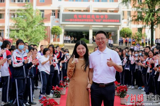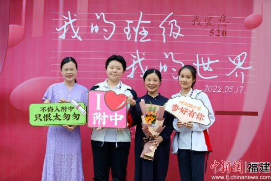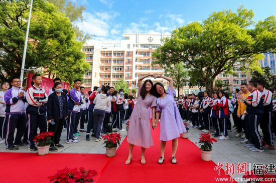 中新网福建新闻5月18日电 (吴晟炜江舟)18日下午,福建师大附中举行第二届班主任节暨首届“功勋”班主任表彰仪式。55位年段长、班主任在学生们的簇拥下走上红地毯。红地毯旁的展板上是同学们为段长、班主任写下的“颁奖词”,以及“功勋”班主任们光辉的班主任年限。