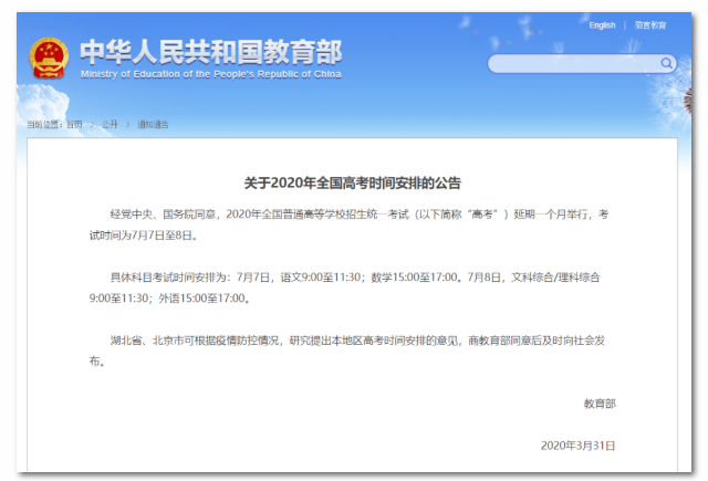 经党中央、国务院同意,2020年全国普通高等学校招生统一考试(以下简称“高考”)延期一个月举行,考试时间为7月7日至8日。